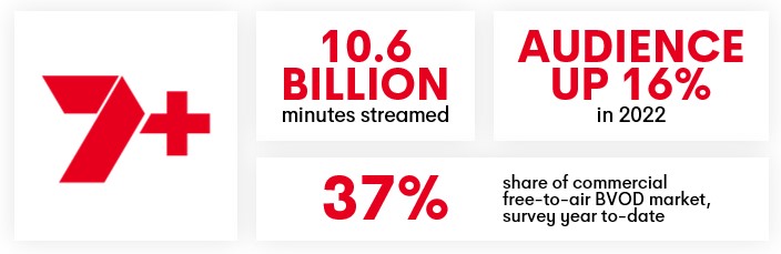 “7plus has also delivered outstanding audience numbers, streaming more than 10.6 billion minutes of content so far this year. The platform reaches over four million active and consented users a month and in 2022, it increased its total live and on-demand streaming by 16% year-on-year.