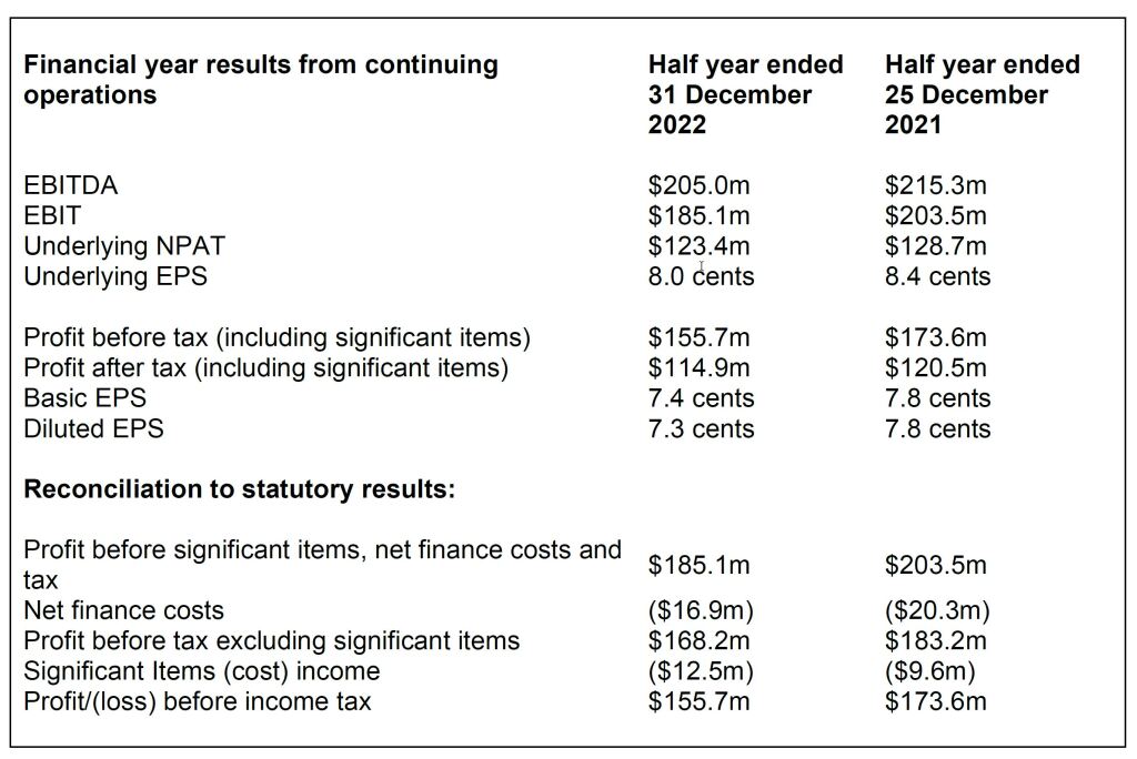 Earnings before interest, tax, depreciation and amortisation (EBITDA) of $205.0 million and earnings before interest and tax of $185.1 million decreased 4.8% and 9.0% respectively versus the previous corresponding period.
