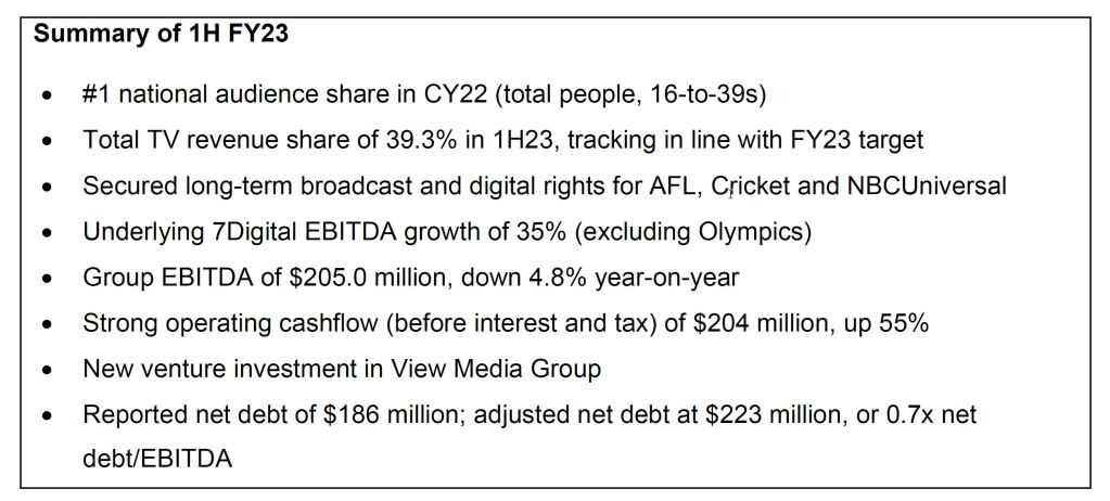 “Our digital earnings have soared from $3 million in the first half of FY19 to $80 million in the most recent period and digital now accounts for approximately 40% of group earnings. The BVOD market continues to grow strongly, up 18% in CY22, even with the Olympics in CY21. We expect our share of this market to grow significantly from the new digital content and sports rights secured.