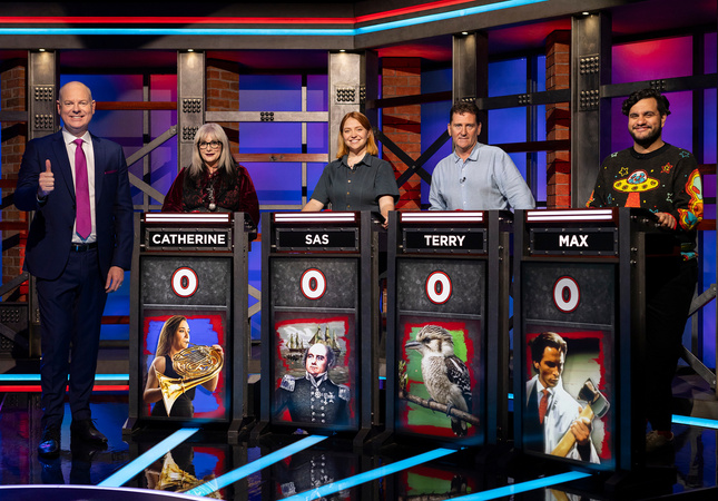Tom Gleeson’s got the Big Brass Mug, and four contestants want it all to themselves. They are Catherine, an expert on the French horn, Sas, who’s all over Franklin’s lost expedition, Terry, with his love of kookaburras, and Max, who knows the film American Psycho inside-out.