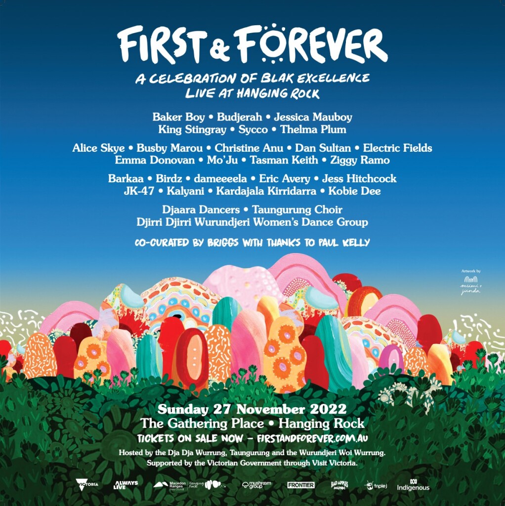 Helmed by the Mushroom Group, Victorian Government and co-curated by Briggs with special thanks to Paul Kelly, First & Forever is performed, filmed and recorded at The Gathering Place, Hanging Rock, lands of the Dja Dja Wurrung, Taungurung and Wurundjeri Woi Wurrung peoples. The must-watch 1.5-hour special brings together an all-star line-up of First Nations icons, outstanding storytellers, award-winning talents and rising stars.