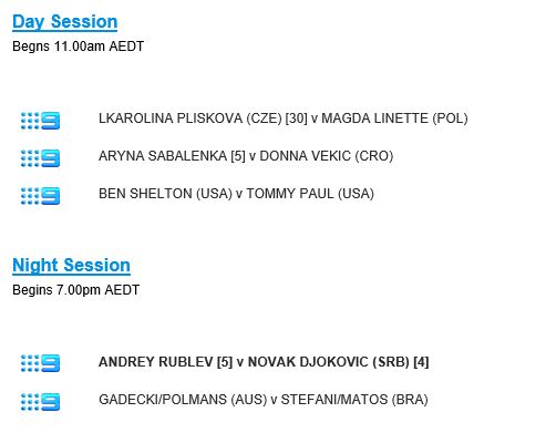 The Novak Djokovic juggernaut rolls into the quarter finals on Day 10 of the 2023 Australian Open with Andrey Rublev, Karolina Pliskova and Aryna Sabalenka all featuring on Channel 9HD and 9Now from 11.00am.