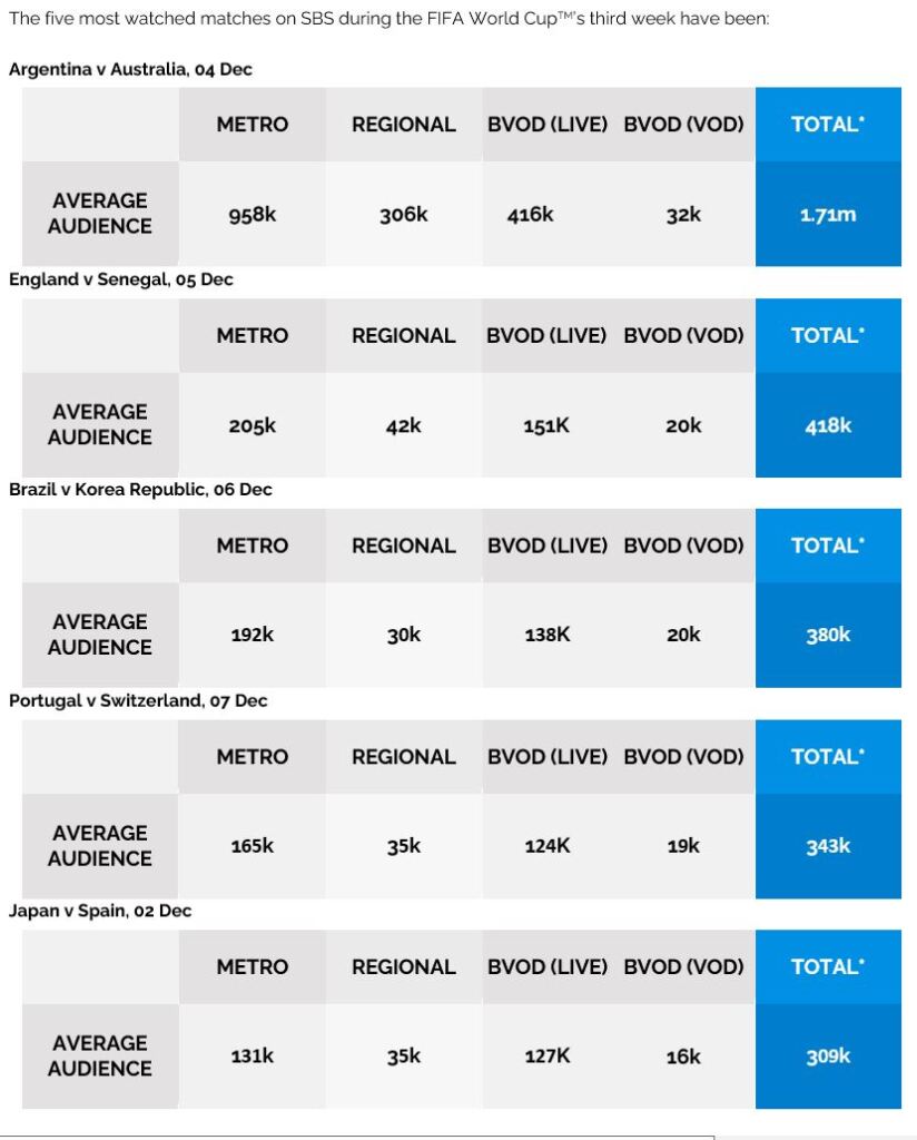 In total, the 2022 FIFA World CupTM live matches have achieved a linear reach on the SBS primary channel and SBS Viceland of 6.2 million viewers to date.