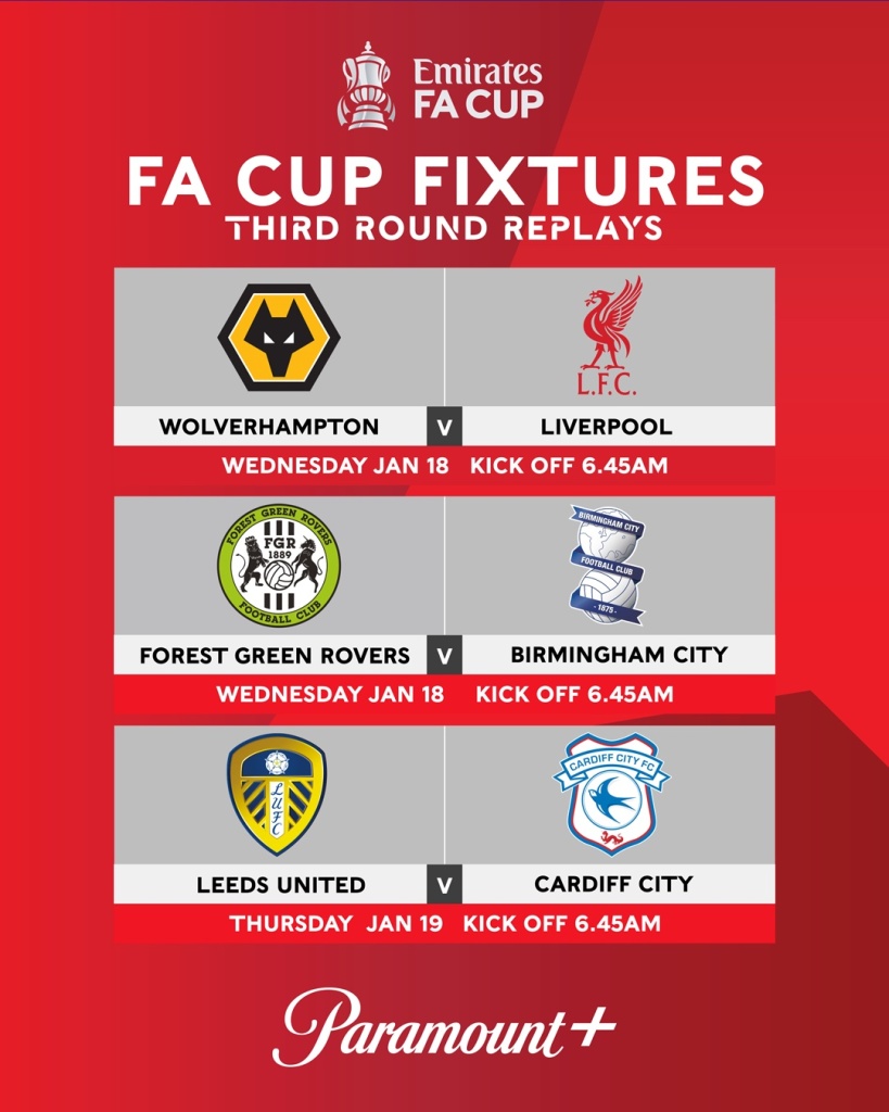 Kicking off the week on Wednesday morning, following a 2-2 draw catch the Emirates FA Cup third round replay between Wolverhampton Wanderers and English Premier League heavyweight Liverpool, plus the rescheduled matched between Forest Green Rovers and Birmingham City both live from 6.35am AEDT exclusive to Paramount+.
