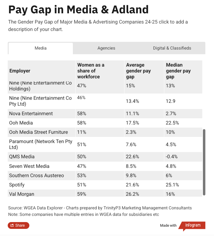 Leading marketing management consultancy TrinityP3 says this year’s data shows some notable improvements (for example, Foxtel, Nine Publishing, and Seven West Media), but the annual data release underscores the persistent pay gap across both advertising agencies and media owners. It further highlights the need for management and corporate boards in these organisations to take greater steps to close the gap.
