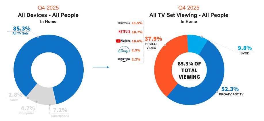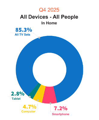 In Q4 2025, the majority of Total People in-home video viewing occurred on TV sets (85.3% of total minutes), followed by smartphones (7.2%), computers (4.7%) and tablets (2.8%).