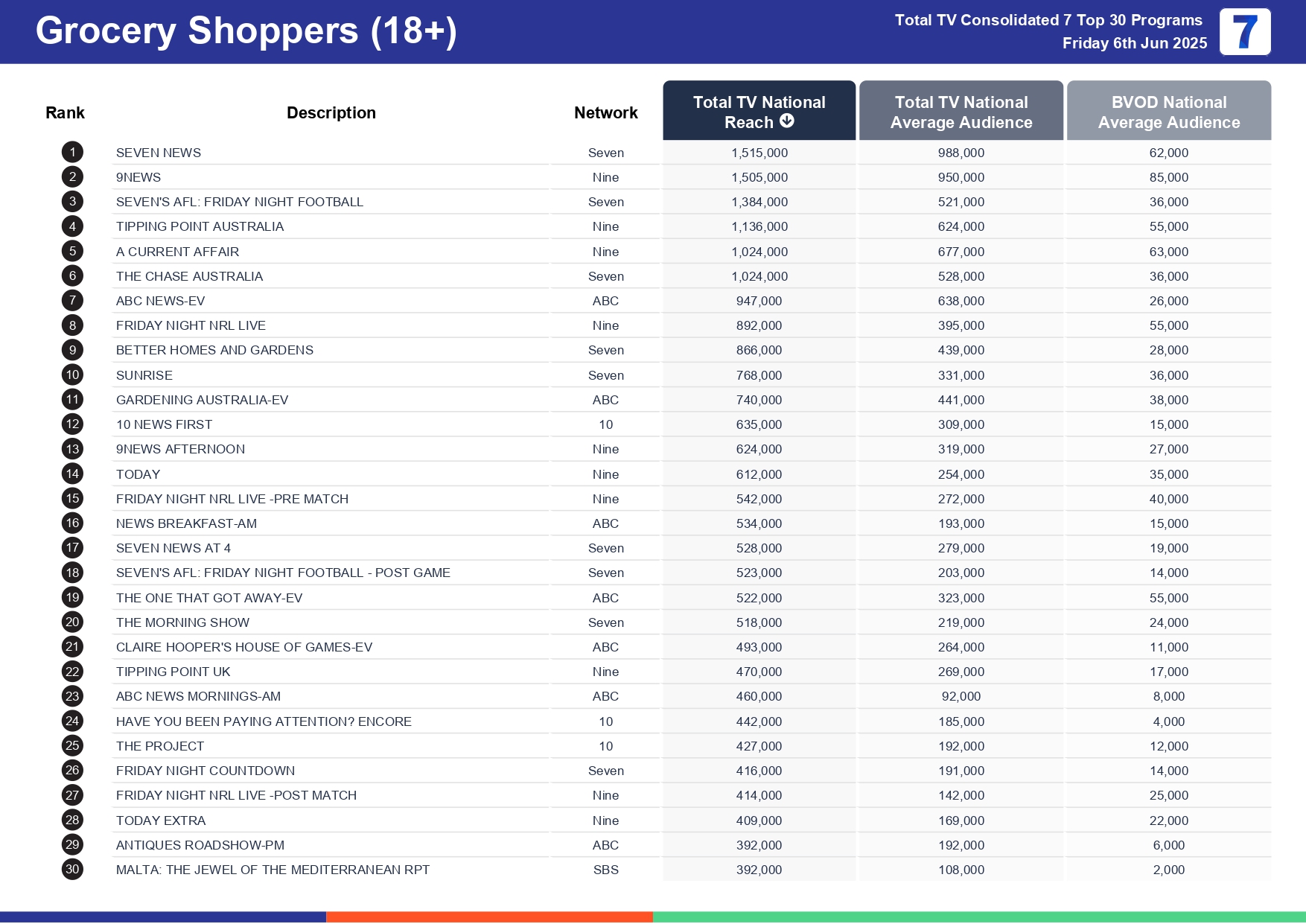 Seven News was #2 for the night with a reach loss of 11 000 and an average audience lead of 20 000 over 9News. Friday Night Countdown was #29 with 475 000 (251 000). Seven’s AFL: Friday Night Football was #3 with 1 653 000 (576 000).