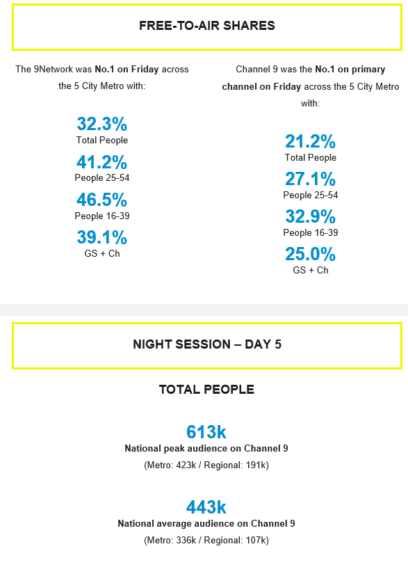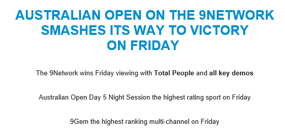 Nine News 6:30 was #3 with no wins in any market. Nine News was #4 and also could not pull off a win in any market. 2023 Australian Open Day 5 – Night Session 2 was #8 for 336 000. 2023 Australian Open Day 5 – Night was 314 000 at #9 and 2023 Australian Open Day 5 – Late was #13 with 246 000.