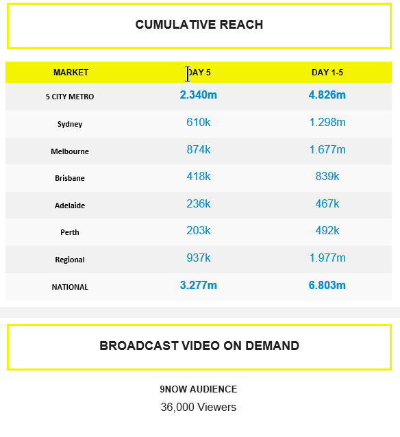 Better Homes and Gardens Summer shot to #1 non news in primetime, placing #5 overall. The 2023 Arena Showdown – Kyrgios v Djokovic was #6 with 127 000, a rise of 21%. The Project was #10 with 101 000. A Grand Royal Design had to settle for #11 in the 25-54 demographic with 99 000, an upswing of 41%. Even though Lord of the Rings: The Return of the King didn’t enter the Top 30 Total People rankings, it did come in at #20 in this demo with 66 000 viewers.