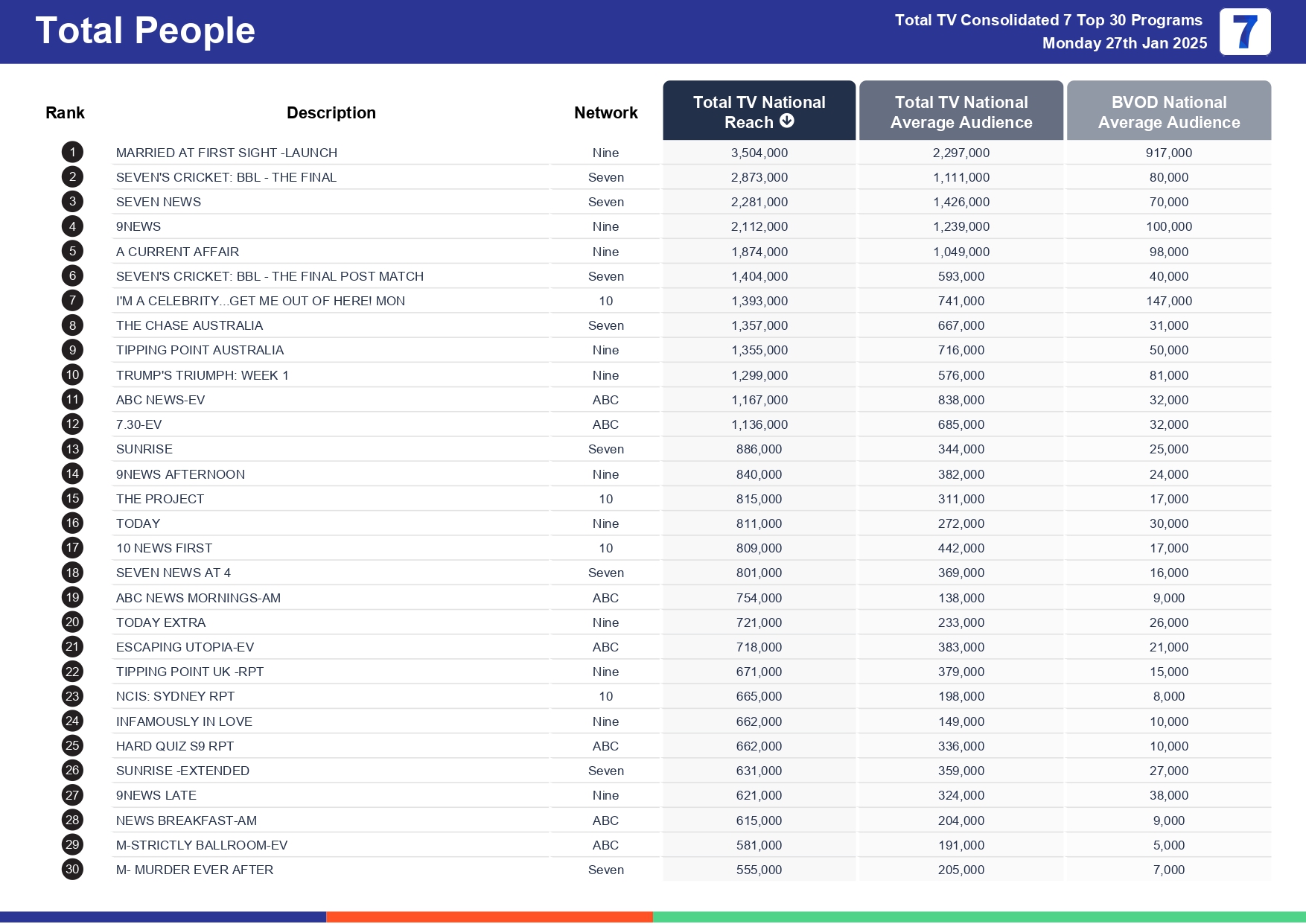 7NEWS Monday: #1 news program. National reach 2.34 million, national audience 1.45 million.