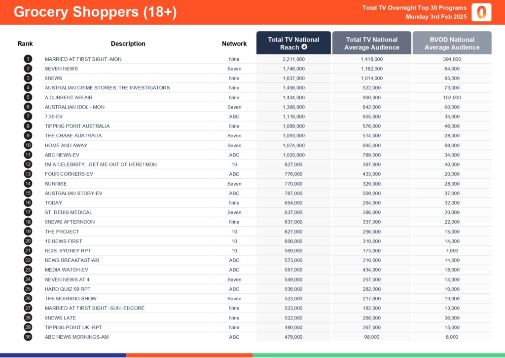 Monday 3 February 2025 TV Ratings Australia Analysis for Total TV Consolidated 7 Day