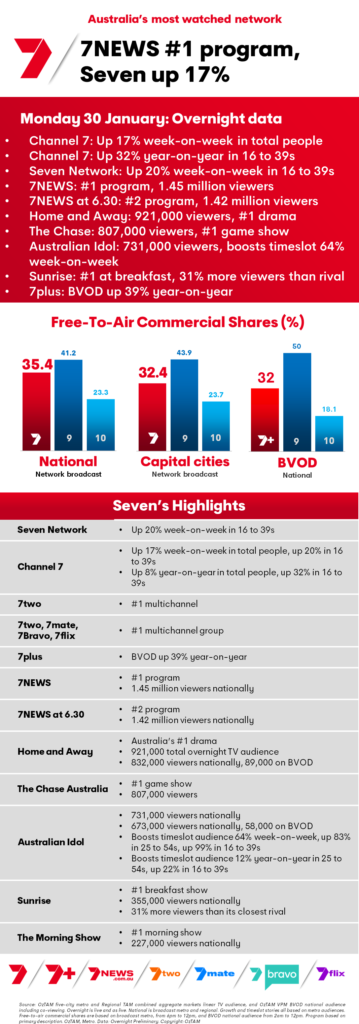 #1 Seven News at 6:30 – 1,411 000 (+3%)