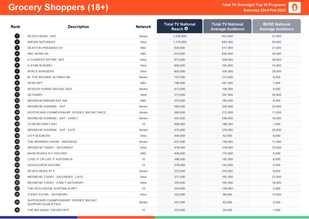 Saturday 22 February 2025 TV Ratings Australia Analysis for Total TV Consolidated 7 Day
