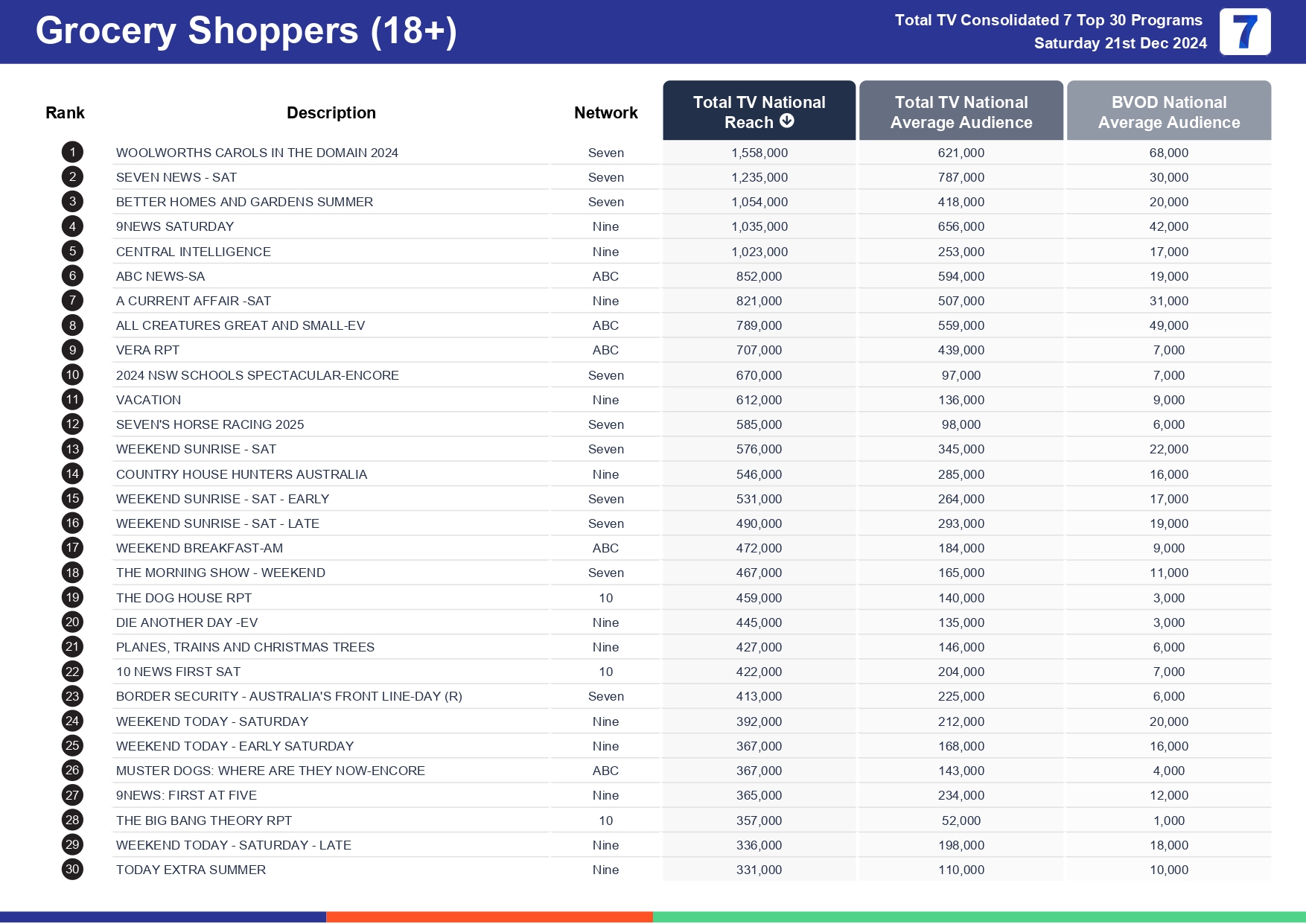 Saturday 28 December 2024 TV Ratings Australia Analysis for Total TV Consolidated 7 Day