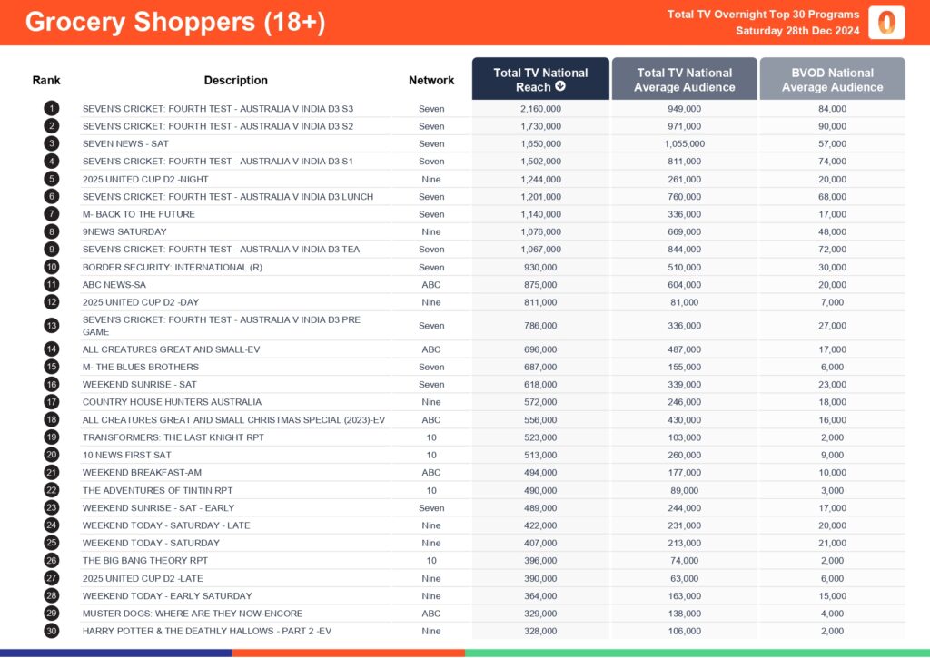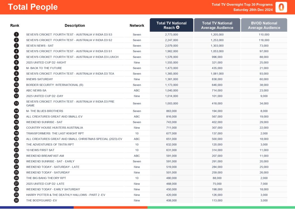Saturday 28 December 2024 TV Ratings Australia