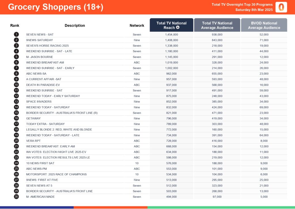 Saturday 8 March 2025 TV Ratings Australia Analysis for Total TV Consolidated 7 Day