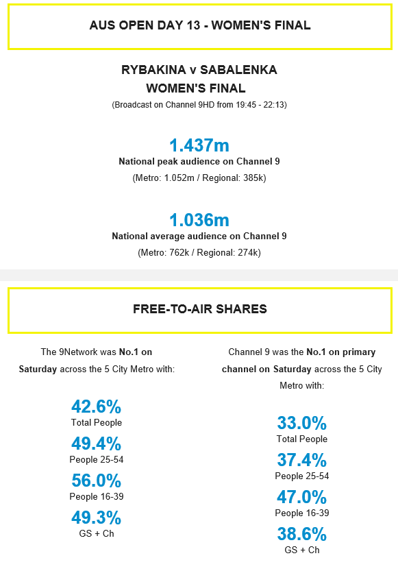 Nine News and the Australian Open continue Nine’s successful Australian Open run.