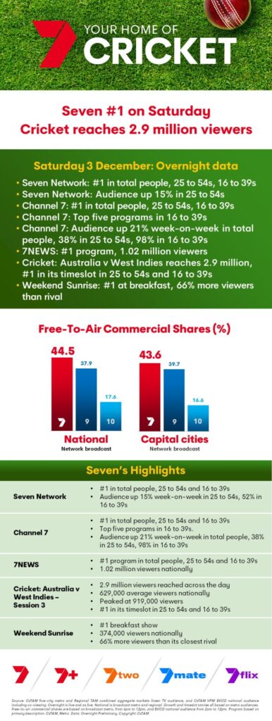 Seven News Saturday was #1 with 695 000 with wins in Sydney, Melbourne, Adelaide and Perth. The highest session in Seven’s Cricket: First Test – Australia v West Indies Day 4 was #5 with 408 000 viewers. The movie, US Marshalls was #20 with 145 000 viewers, airing at different times across the network.