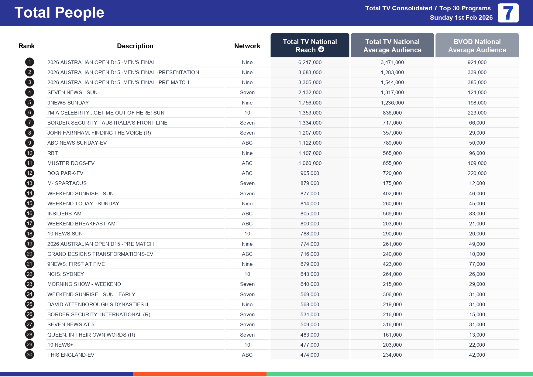 Winter Olympic Games 2026 Late, Day 2 (22:30-24:00) – dominated its timeslot across Australia with Total People and all key demographics. It achieved a National Total TV Reach of 1.526 million, a Total TV National Audience of 675,000 and a BVOD audience of 128,000.