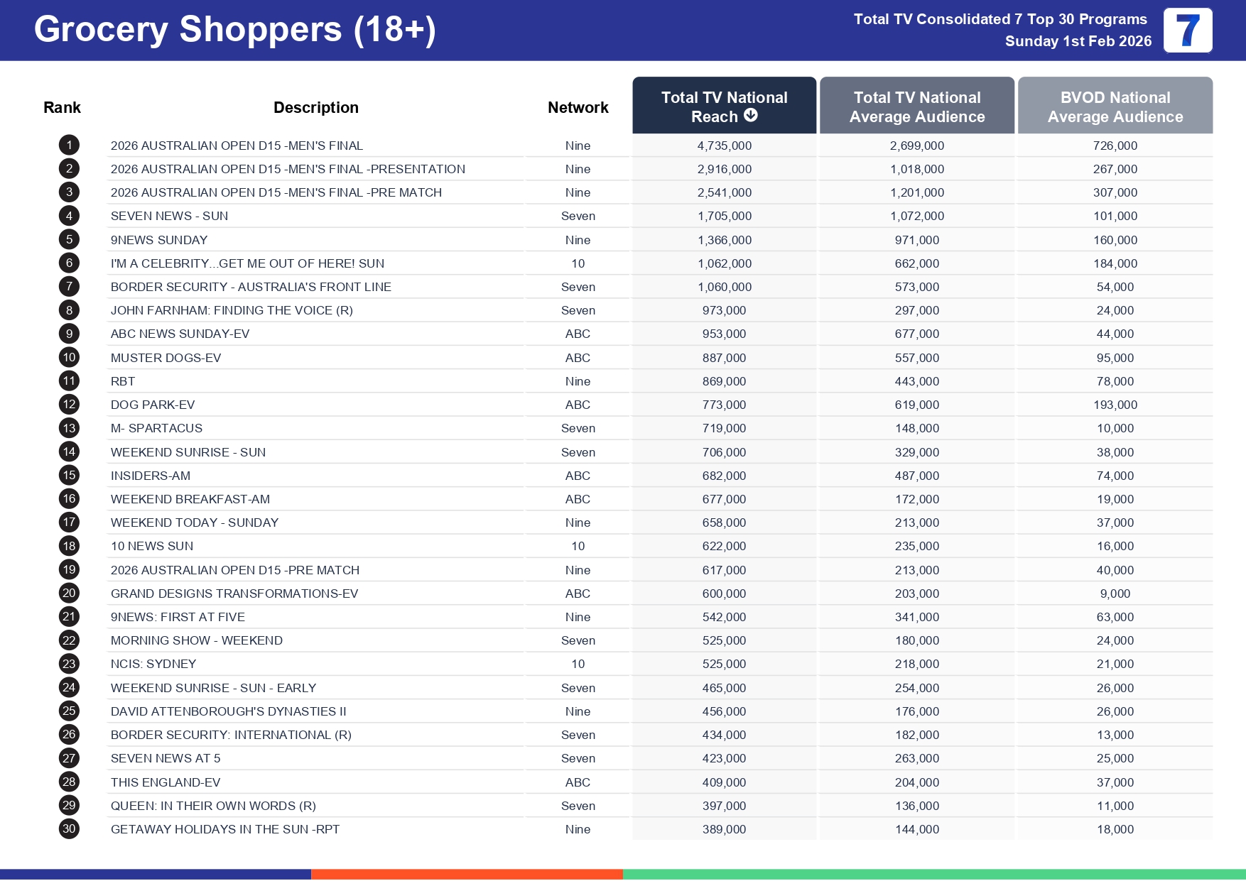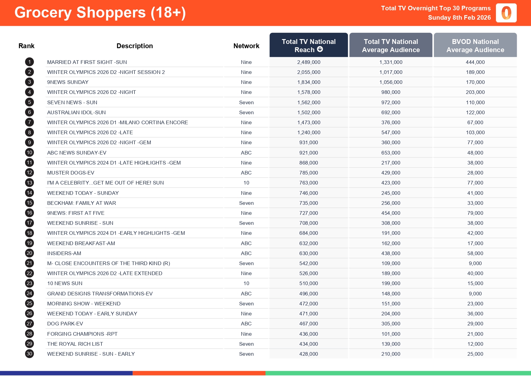 Winter Olympic Games 2026 Night Session 2, Day 2 (21:00-22:30) – was Australia’s No.3 program of the night with Total People and all key demographics. It achieved a National Total TV Reach of 2.595 million, a Total TV National Audience of 1.280 million and a BVOD audience of 236,000.