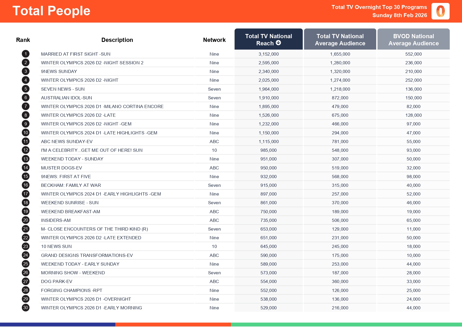 9News was #3 for the night. Married at First Sight – Sunday was #1 with 3 152 000 (1 655 000). Winter Olympics 2026: Night was #4 with 2 025 000 (1 274 000). Winter Olympics 2026: Night Session 2 was #2 with 2 595 000 (1 280 000). Winter Olympics 2026: Late was #8 with 1 526 000 (675 000). Winter Olympics 2026: Late – Extended was #22 with 651 000 (231 000). Winter Olympics 2026: Overnight was #29 with 538 000 (136 000). Winter Olympics 2026: Early Morning was #30 with 529 000 (216 000).