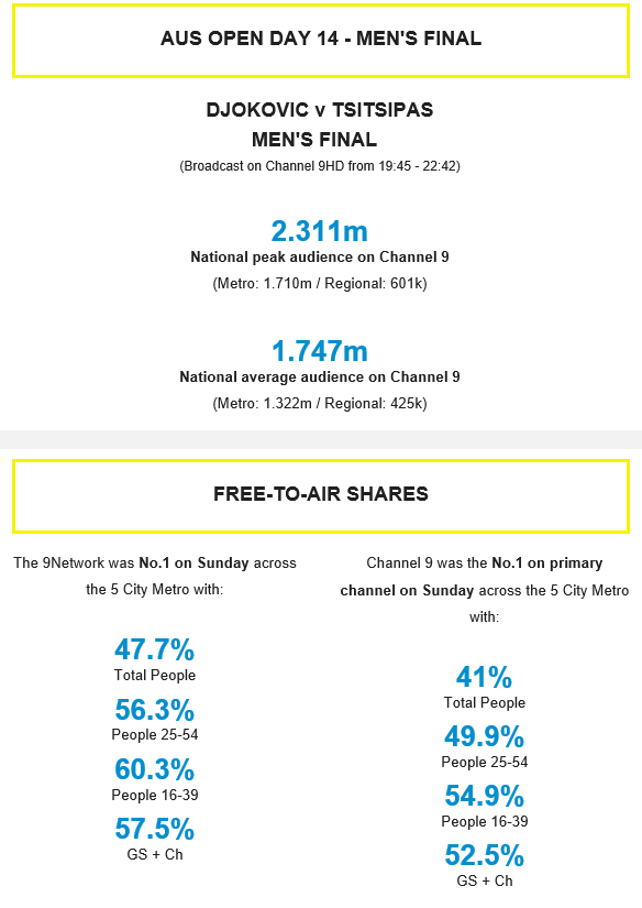 Nine News Sunday was #4 with no wins in any market. The 2023 Australian Open Day 14 – Men’s Final was #1 with 1,322 000 fans. The 2023 Australian Open Day 14 – Men’s Final – Presentation had 1,053 000 watching. The 2023 Australian Open Day 14 – Men’s Final Pre Match was #5 with 585 000