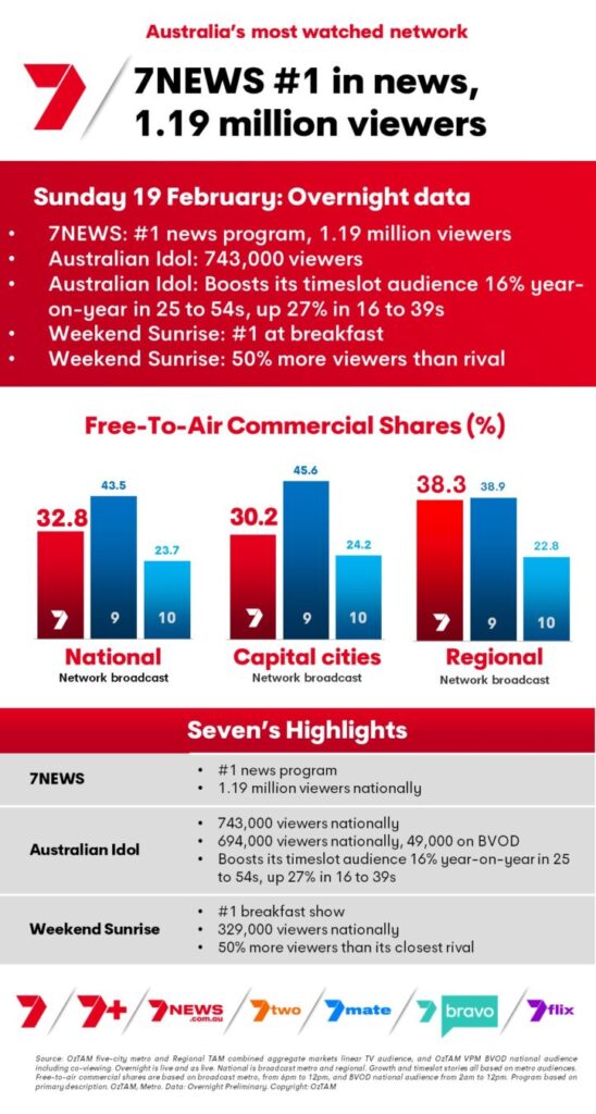 Seven News – Sunday was #2 with wins in Sydney, Brisbane, Adelaide and Perth. Australian Idol was #9 with 441 000 viewers. Seven completely sank after that with a repeat of Kylie vs Bee Gees at #17 with just 184 000 viewers. Maternal episode 4 had just 84 000. Episode 5 of Maternal was down to just 58 000.
