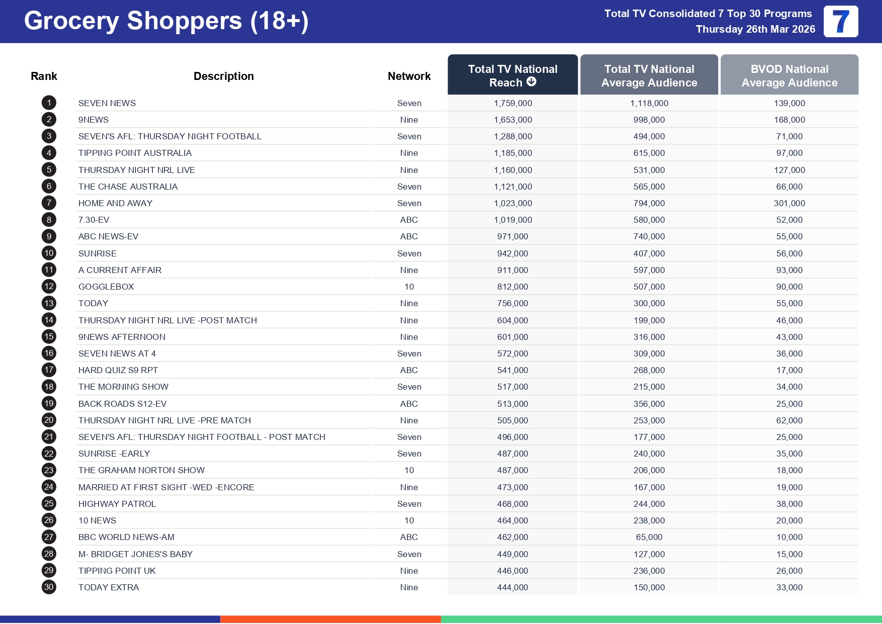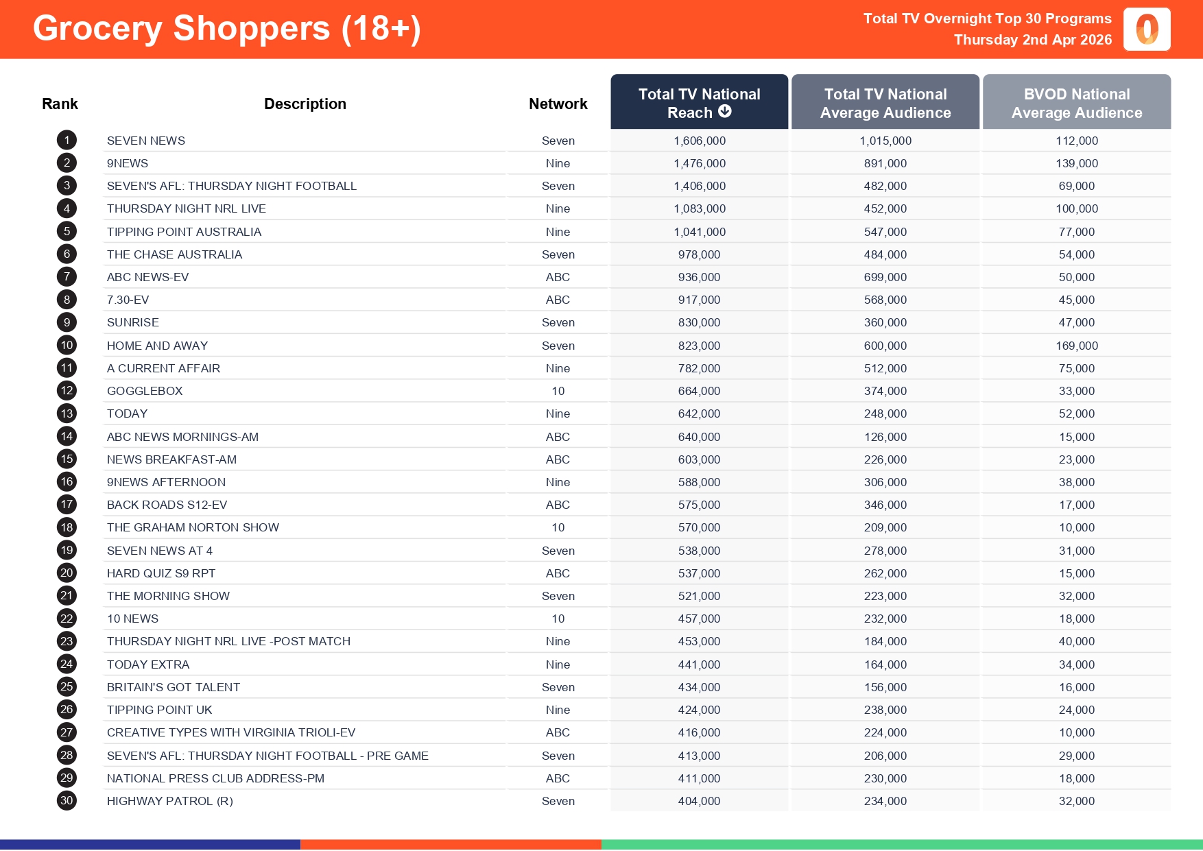 Thursday 2 April 2026 TV Ratings Australia Analysis for Total TV Consolidated 7 Day