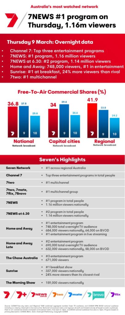 - Channel 9 wins Thursday night as No.1 primary channel across all key demographics and Total People