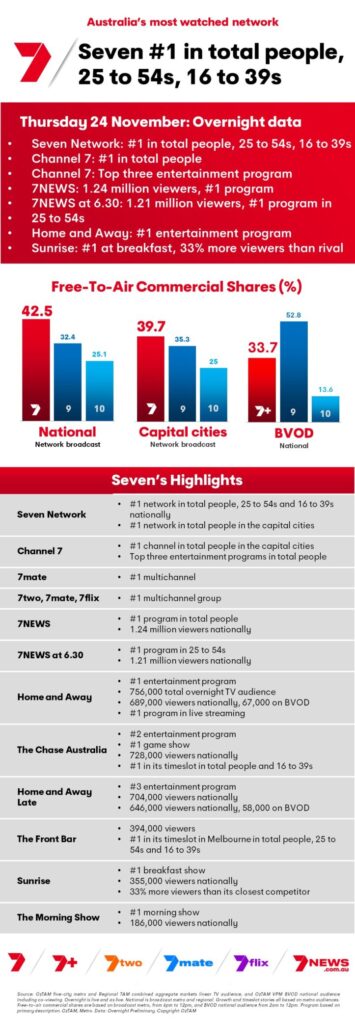 Seven News was #1 with 1,239 000, a rise of 3%. Seven News at 6:30 was #2 with 1,229 000, also a rise of 3%. The average of the 7pm and 7:30pm episodes of Home and Away was #4 for the night with 897 000, up 24%. Home and Away – Late (8pm episode) was #7 with 848 000, up 27%. The Front Bar was #13 for the night with 467 000 and was up 14%. The Chase Australia performed strongly with 676 000 and a rise of 3% to be the #10 show of the day. The Chase Australia – 5pm was #15 with 411 000, up 4%. Sunrise had a final 7 day total of 395 000 to land at #17 and rose 4%. Sunrise – Early was #30 with 258 000, up 5%. Seven News at 4:30 also made the Top 30 at #27 with 268 000, an uplift of 3%.