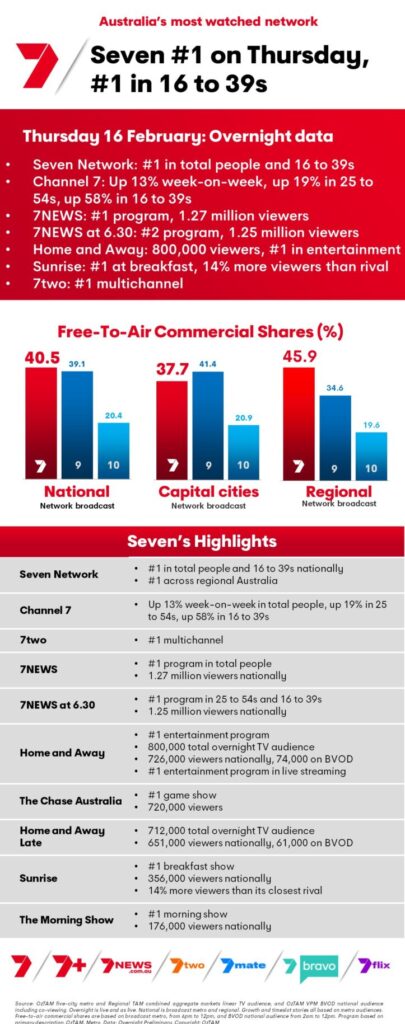 Seven News was #1 with wins in Melbourne, Brisbane, Adelaide and Perth. Seven News at 6:30 was #2 with wins in Melbourne, Adelaide and Perth. Home and Away was #8 with 456 000 viewers, an average of the 7pm and 7:30pm episodes. Home and Away – Late was #11 with 402 000 for the 8pm episode. A repeat of The Very Best of the Best and Worst of Red Faces was #19 with just 249 000 viewers. A repeat of Mrs. Brown’s Boys had a viewership of 156 000. The Latest: Seven News had 81 000. An encore of The Front Bar: All Stars Edition had a low 32 000.