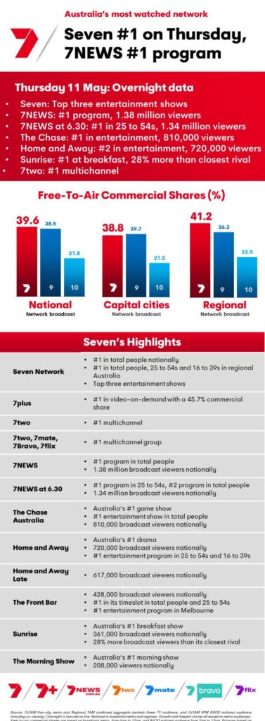 Nine News was #3 with no wins in any market. Nine News 6:30 was #4 with a 2000 viewer win in Melbourne. A Current Affair was #5 overall, but #1 in its slot with 582 000. Thursday Night NRL Live – Pre Match was #13 with 325 000 fans across 9 and 9Gem. Thursday Night NRL Live was #9 with 421 000 viewers across 9 and 9Gem. Thursday Night NRL Knock Off was #18 with 238 000 viewers watching in Sydney and Brisbane on 9 and in Melbourne, Adelaide and Perth on 9Gem.