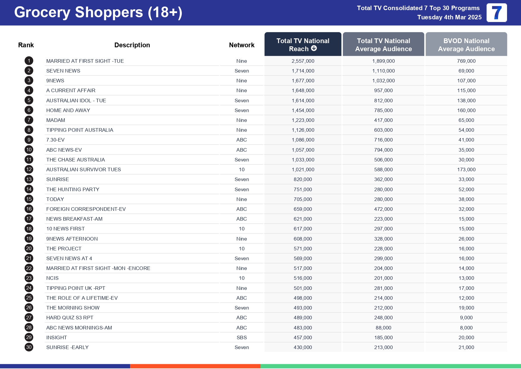 Tuesday 11 March 2025 TV Ratings Australia Analysis for Total TV Consolidated 7 Day