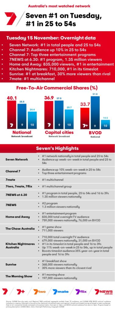 Seven News was the #1 program overall in last Tuesday’s Top 30 Total TV rankings report. The news service had an uplift of 3% for a total 7 day audience of 1,394 000 viewers. Seven News at 6:30 also rose 3% to 1,384 000. Home and Away was #6 overall but #1 non news with 929 000, increasing by 20%. Kitchen Nightmares Australia is a solid performer with 848 000, up 31%. The Good Doctor was on 521 000, a rise of 43%. The Chase Australia was on 755 000, up 3% and was #11 overall for the night. The Chase Australia -5pm was on 466 000, up 4%. Seven News at 4:30 had 331 000 viewers, up 2%. Sunrise was #22 with 376 000, up 5%.