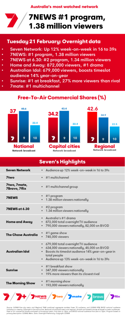 Seven News was #1 with wins in Melbourne, Brisbane, Adelaide and Perth. Seven News at 6:30 was #3 with wins in Melbourne, Adelaide and Perth. Home and Away was #8 with 488 000. Australian Idol was #12 with 423 000 and announced its Top 12, ready for the live shows this Sunday and Monday. The Good Doctor was #24 with 202 000. Quantum Leap had 86 000 viewers. The Latest: Seven News was on 68 000.