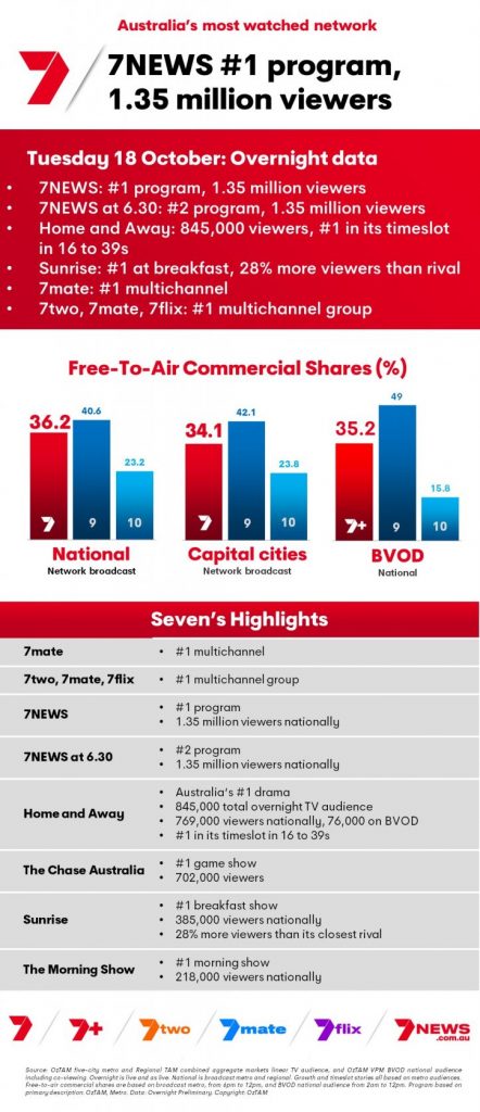 Seven News at 6:30 was the #1 show overall for the evening sitting at 1, 394 000, a rise of 3%. Home and Away was up 21% to 954 000. This is Your Life, celebrating the career of Ray Meagher did well, increasing its audience by 18% to receive a total audience of 1, 113 000. The Good Doctor always does well in Total TV, this time up 33% to 586 000.