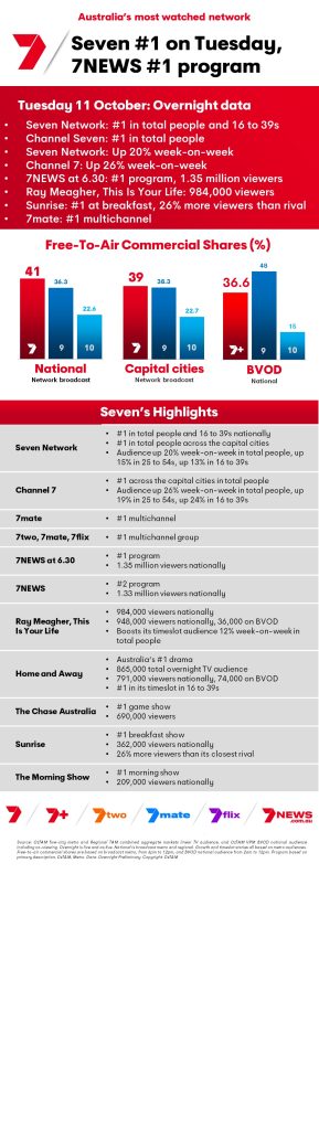 Seven News had a 5 capital city win overall, with specific wins in all markets, except Sydney. Home and Away had 494 000 viewers which was a perfect lead in for the 595 000 celebrating the life and career of Ray Meagher on This is Your Life. The Good Doctor returned to 276 000 viewers, second in its slot. 10 Years Younger in 10 Days had 120 000.