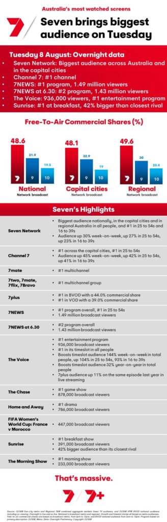 7mate was the #1 multi channel thanks to FIFA Women’s World Cup 2023 – France v Morocco (#1 with 333 000) and FIFA Women’s World Cup 2023 – France v Morocco – Pre Game (#2 with 166 000).