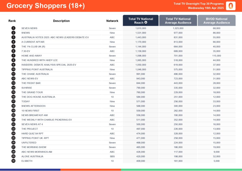 Wednesday 16 April 2025 TV Ratings Australia Analysis for Total TV Consolidated 7 Day