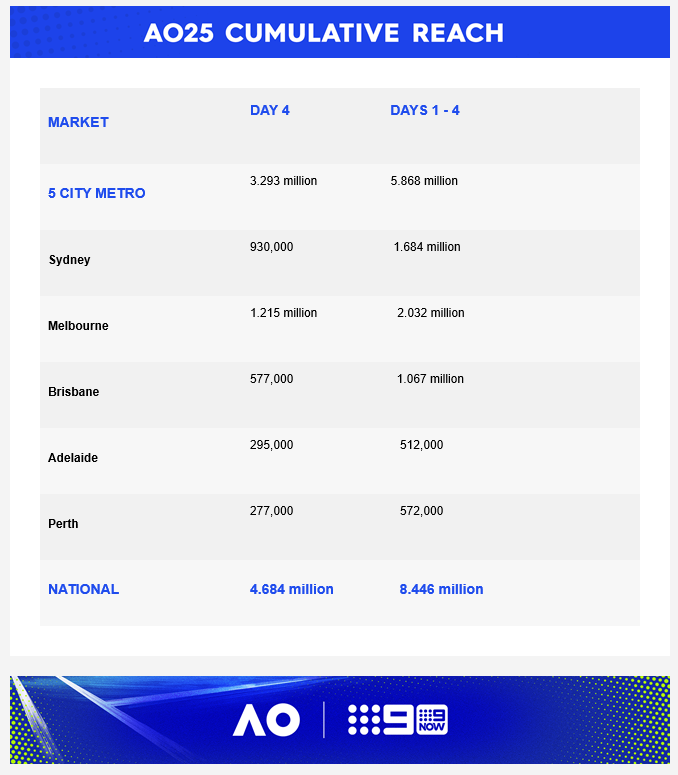 2026 Australian Open Day 4 Day Session secured a National Total TV Reach of 2.219 million, a National Total TV Average Audience of 371,000 (up 0.5% on the same day last year) and a BVOD audience of 83,000 – up an astounding 112.8% year-on-year.