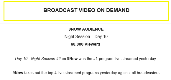 - 437,000 total national audience (metro + regional + live stream + 1 day BVOD).
