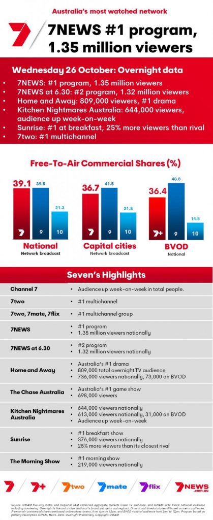 Seven News 6pm was #2 for the evening with 837 000 and wins in Melbourne, Brisbane, Adelaide and Perth. The 6:30pm half hour of the News was #1 at 838 000. Home and Away was on 429 000. Kitchen Nightmares had 371 000 viewers at 7:30pm. Extreme Weddings Australia (with 1 episode left to go) had 147 000, whilst Air Crash Investigations, built on its lead in with 150 000. However, when regional figures are combined, Extreme Weddings has more viewers than Air Crash Investigations. The Latest: Seven News had 112 000 viewers.