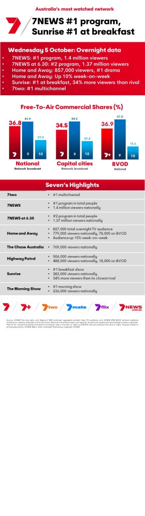 Seven News was the #1 show for the evening with wins in Melbourne, Adelaide and Perth and a tie in Brisbane. Home and Away had 493 000 viewers but usually rises substantially in Total TV. Seven scrapped plans for a second a second ABBA special and instead brought in repeats of Highway Patrol that did not do any better capturing 305 000 viewers fir the first episode and 280 00 for the second. Air Crash Investigations did only 190 000 viewers and The Amazing Race was on 85 000 viewers, hence why it was moved out of its 8:30 slot.