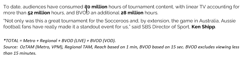 The 2am match drew an average audience of 976,000 viewers, with linear accounting for 501,000 and BVOD for 475,000, via SBS On Demand.