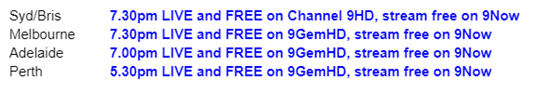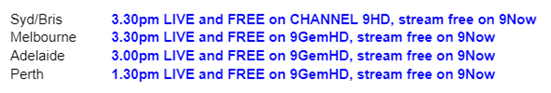 HOSTPLUS QLD CUP – From 2.10pm AEST. Western Suburbs Magpies v Sunshine Coast Falcons, available on the 9Now pop-up channel live and free.