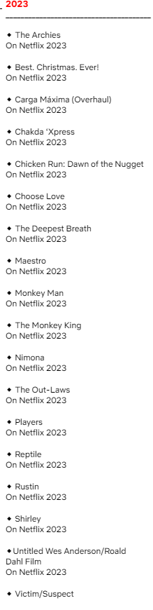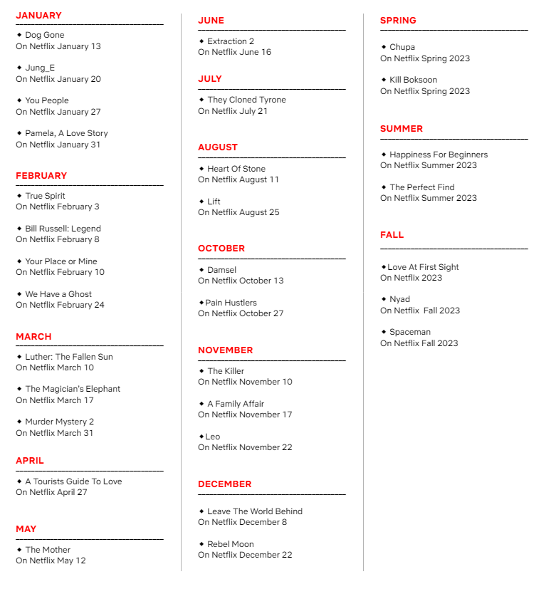 Extraction 2, Heart of Stone, Rebel Moon, The Mother, Your Place or Mine, Damsel, The Killer, They Cloned Tyrone, Murder Mystery 2, Leave the World Behind, Lift, Leo, Pain Hustlers, Luther: The Fallen Sun, A Family Affair, & You People.